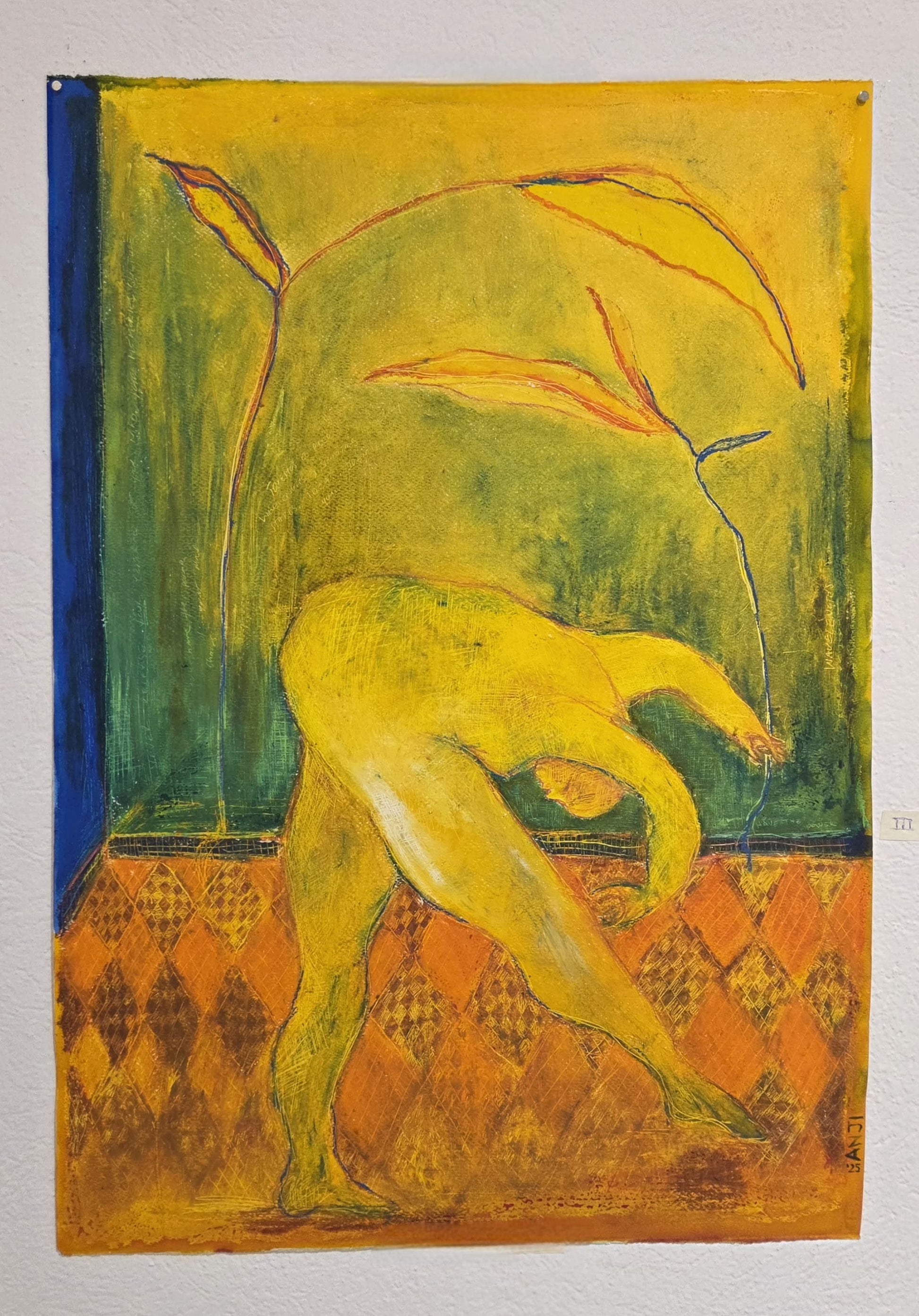 Mixed media: Oil pastel, acrylic, and ink on cotton paper, etched details